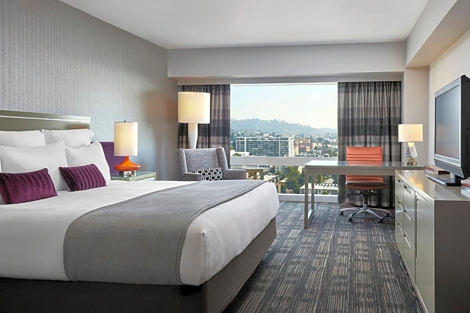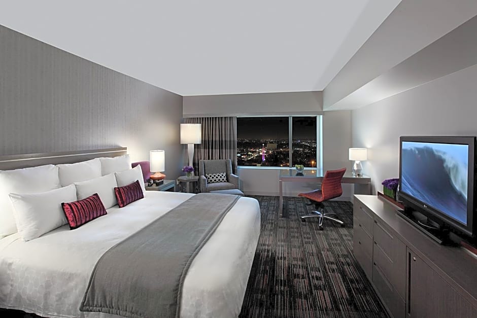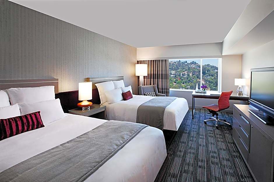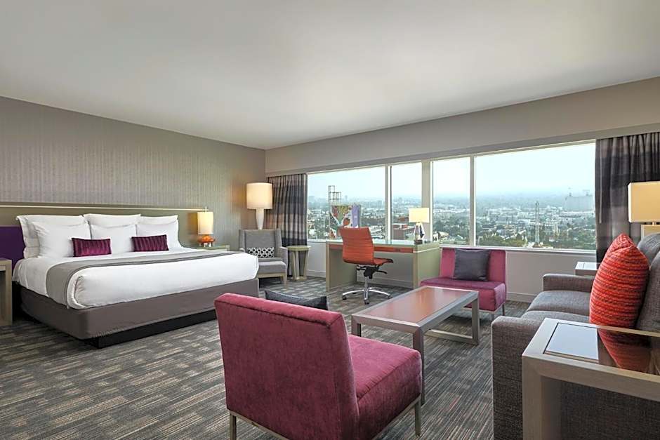 This spacious suite includes a seating area with a full-size sofa, a desk, a flat-screen TV, and views of the Hollywood sign or the Los Angeles skyline.